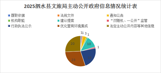 今年以来,泗水县文化和旅游局坚持以“公开为常态、不公开为例外”,紧扣“文旅提质年”主线,聚焦群众关切、企业所需、改革所向,持续深化公共文化、市场执法、产业发展、非遗传承等重点领域信息公开,不断提升公开质效和服务温度。为全面总结我局政府信息公开工作开展情况,现将2025年度政府信息公开工作报告如下。